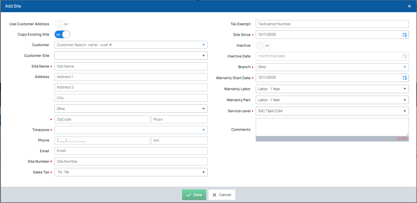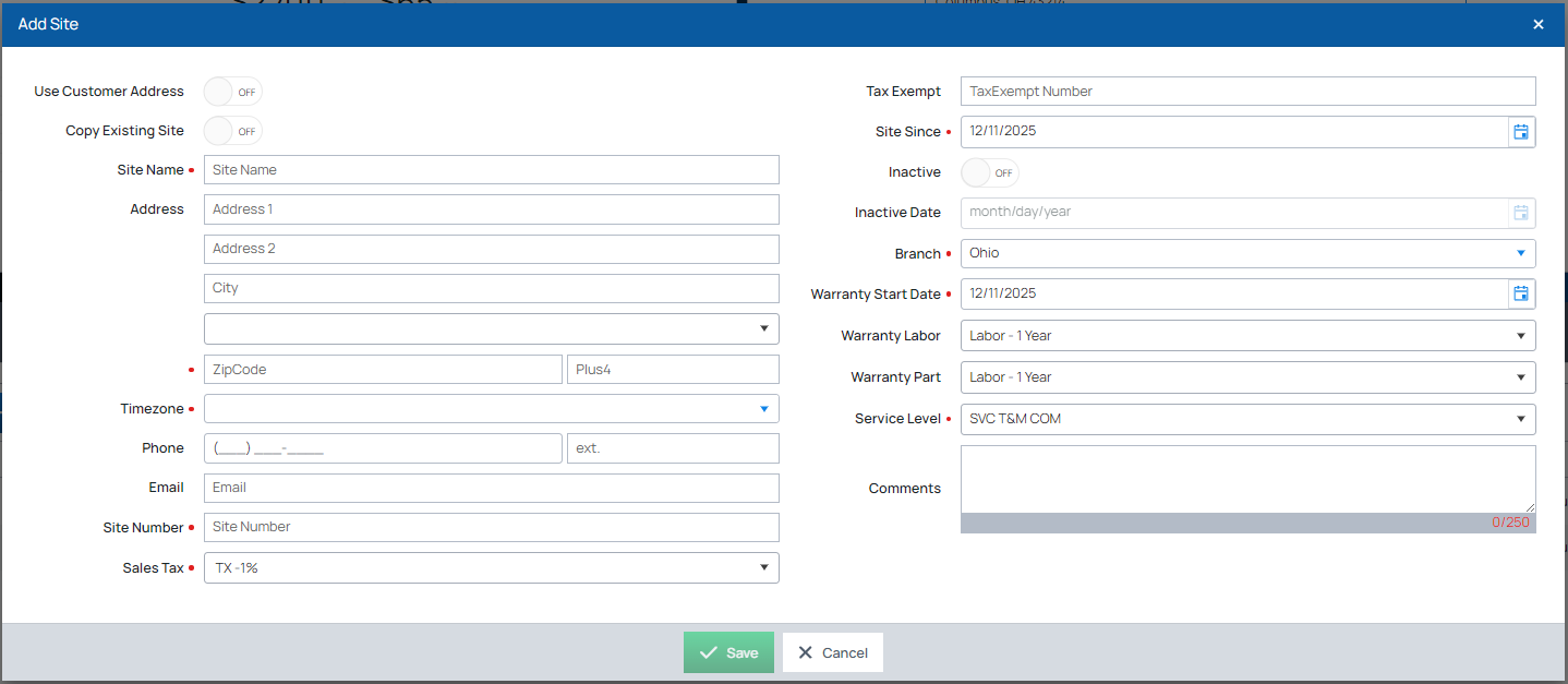 - Use Customer Address: If the Site address is the same as the customer address, set this toggle switch to ON, and the address information will fill in with the customer address information.