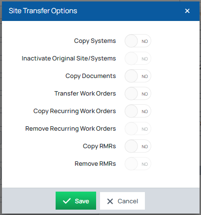 Transfer Work Orders: If YES, this moves all existing active work orders that were previously associated with the site over to the newly created site. All closed work orders remain associated with the previous site.