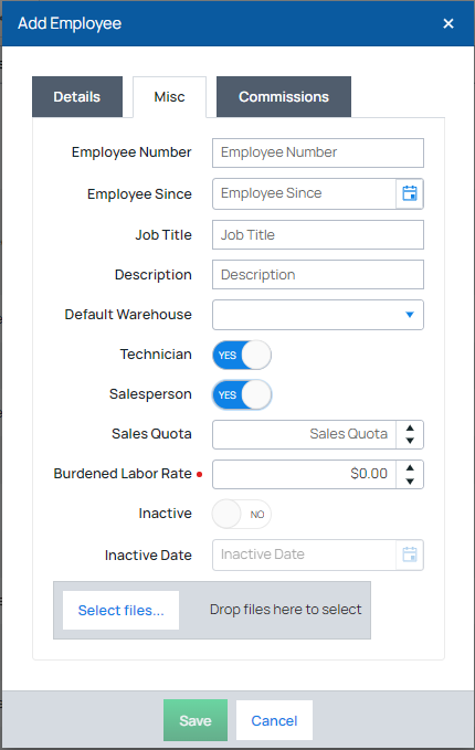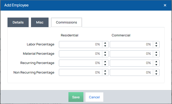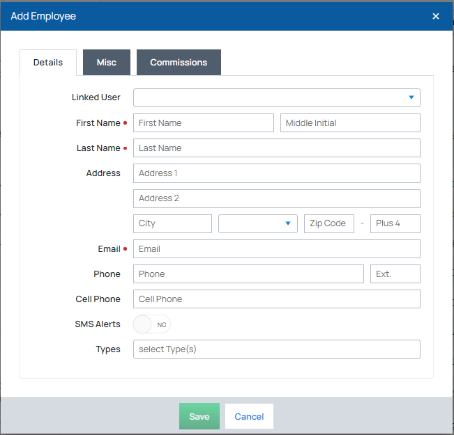 The Employee Edit form opens. This form is comprised of three tabs: Details, Misc, and Commissions. The information on the Misc tab is optional. Fill in the fields on the forms, and then click the Save button at the bottom when finished.
