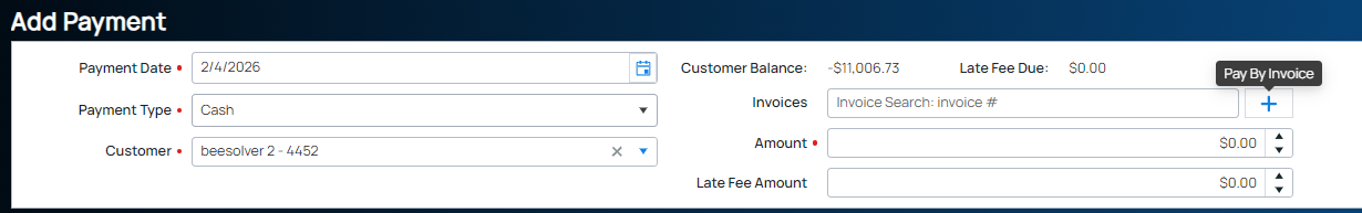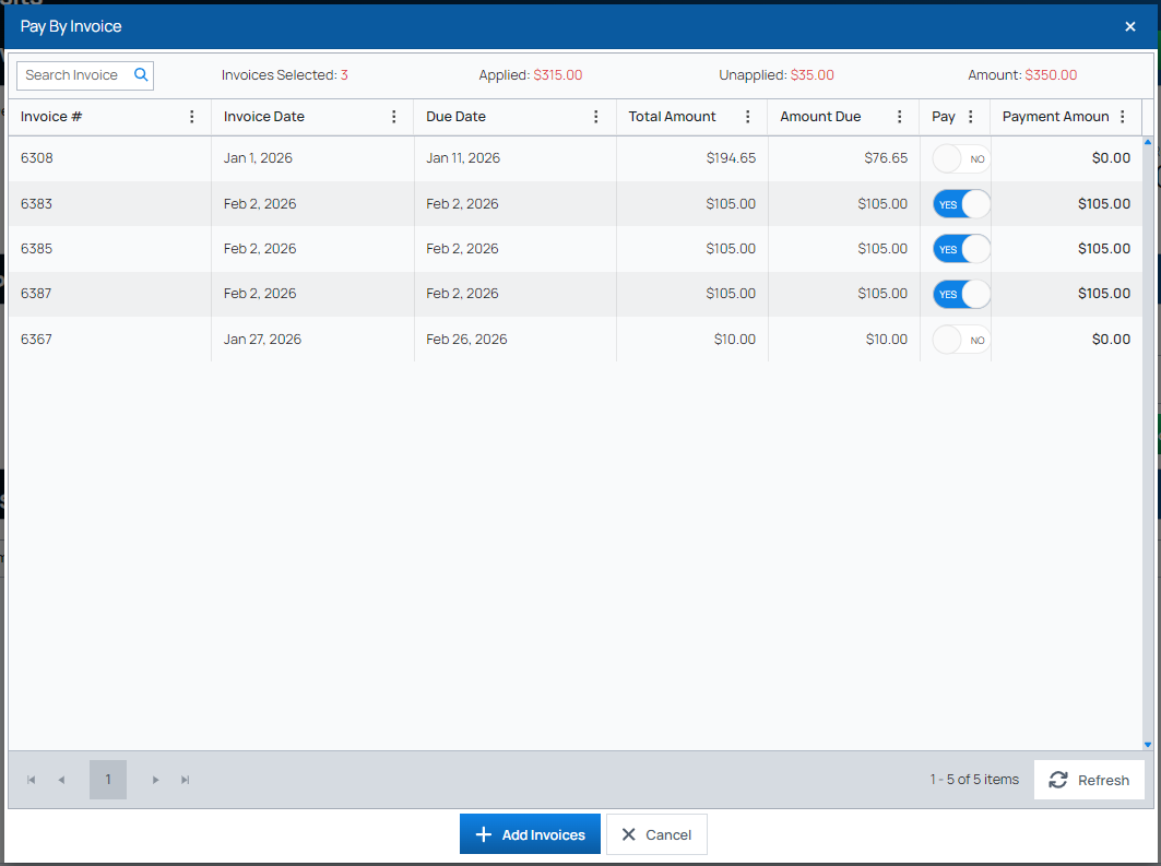 In an invoice row, click the Pay switch from NO to YES. The Payment Amount defaults to the full invoice amount if possible. Repeat this for other listed invoices. Users can enter the full amount on an invoice or a partial amount. Click the Add Invoices button. Any leftover amount goes to unapplied cash on the customer’s account.