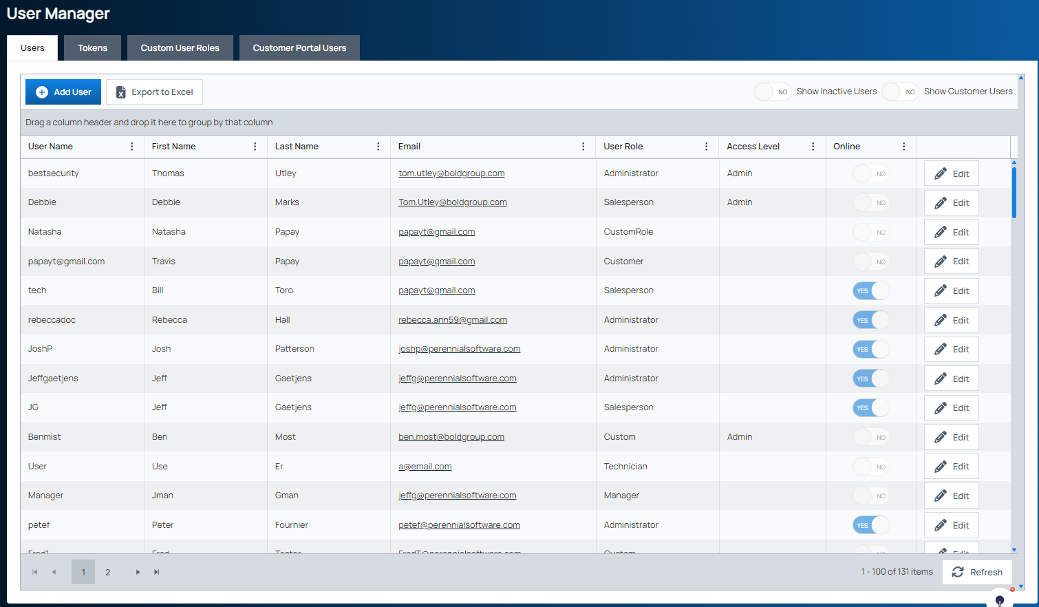 The User Manager page lists existing users in a grid. There are two types of users: internal users, a company’s employees, and customer users. There are switches at the upper right of the page to view inactive users or customer users. By default, the grid shows active internal users.