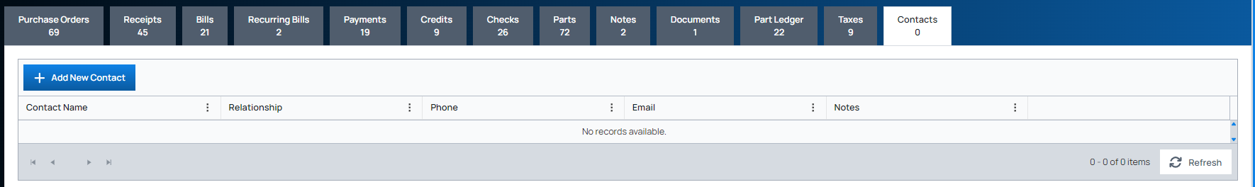 The Vendor detail page (Accounts Payable > Vendors > Vendor # hyperlink), has a Contacts tab. Use this tab to add vendor contacts and view a list of exiting contacts:
