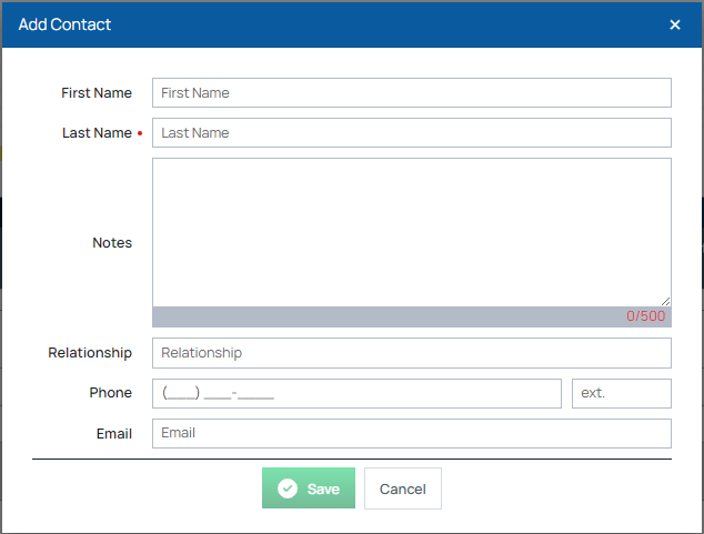 You can sort the information in the columns (Contact Name, Relationship, Phone, Email, and Notes) and can filter the information in any of the columns.