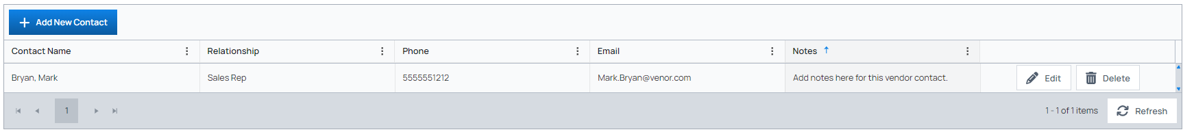 After adding contacts, you can edit or delete any using the buttons in the grid row.