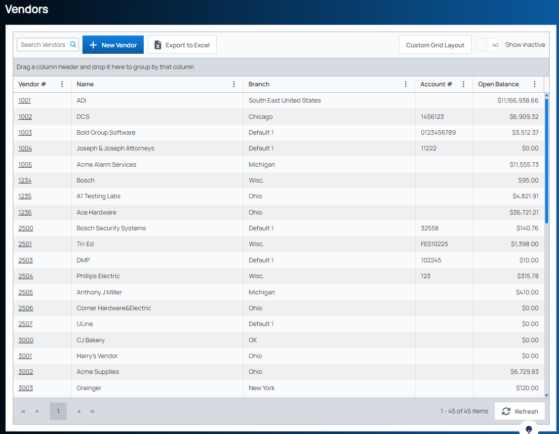 - Click on the hyperlink of a Vendor # to open the vendor record.